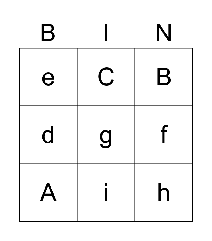 This bingo card has 9 words: A, B, C, d, e, f, g, h and i.