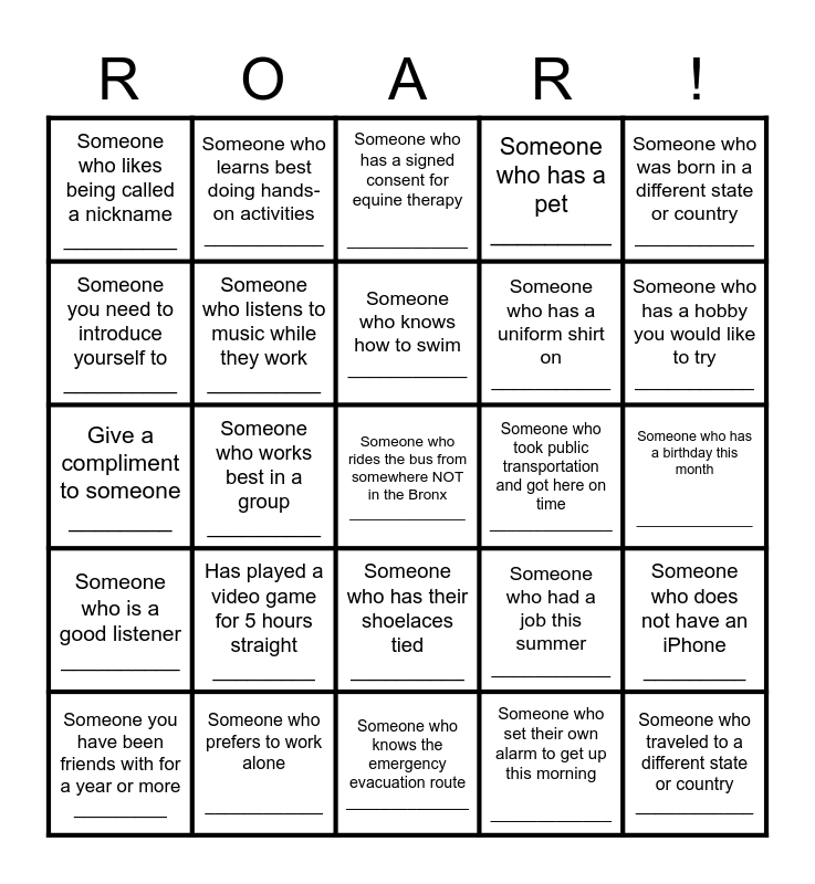 This bingo card has 35 words: Someone who has a hard time apologizing when they're wrong ____________, Someone who pays attention best when its quiet __________, Someone who has never left the building without permission ______________, Someone who has a uniform shirt on ___________, Someone who traveled to a different state or country ____________, Someone who likes being called a nickname __________, Someone who listens to music while they work __________, Someone who has been in an ambulance __________, Someone who took public transportation and got here on time ______________, Someone who went to the beach this summer __________, Give a compliment to someone ________, Someone who learns best doing hands-on activities ___________, Someone who has their shoelaces tied __________, Someone who has a younger sibling __________, Someone who was born in a different state or country ___________, Someone who is a good listener __________, Someone who prefers to work alone ____________, Someone who has a signed consent for equine therapy _____________, Someone who set their own alarm to get up this morning _____________, Someone who has a birthday this month _______________, Someone you have been friends with for a year or more _________, Someone who works best in a group __________, Someone who rides the bus from somewhere NOT in the Bronx ______________, Someone who attended summer school _____________, Someone who has a hobby you would like to try ___________, Someone you need to introduce yourself to __________, Someone who gets more work done when they can take short breaks _____________, Someone who knows the emergency evacuation route ______________, Someone who had a job this summer ___________, Someone who does not have an iPhone _________, Someone who has participated in a team sport ____________, Has played a video game for 5 hours straight _________, Someone who knows how to swim ___________, Someone who has a pet _________ and Someone who celebrates a different holiday than you _____________.