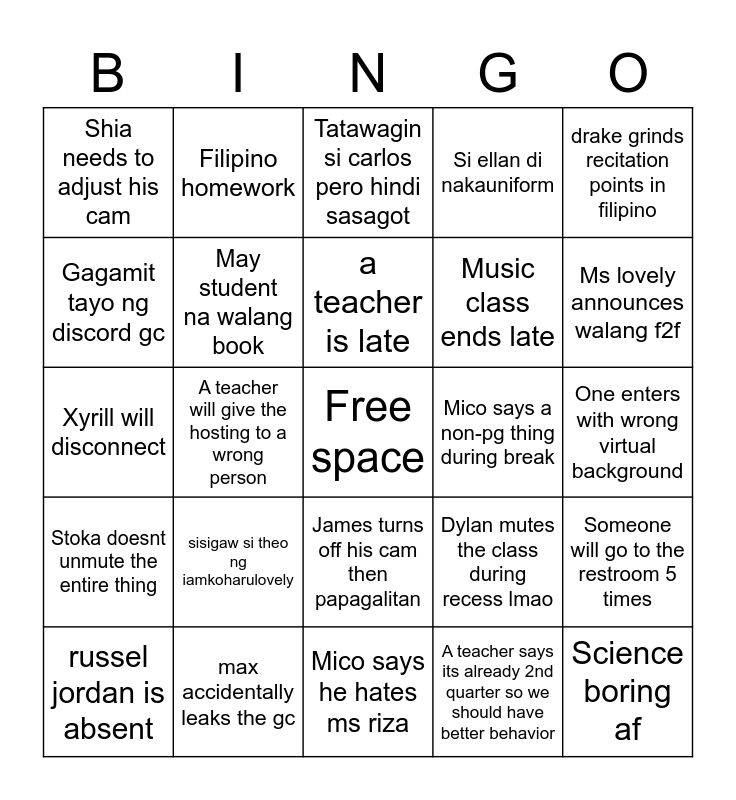 This bingo card has a free space and 24 words: sisigaw si theo ng iamkoharulovely, max accidentally leaks the gc, a teacher is late, russel jordan is absent, drake grinds recitation points in filipino, Shia needs to adjust his cam, Gagamit tayo ng discord gc, Filipino homework, Mico says a non-pg thing during break, James turns off his cam then papagalitan, Music class ends late, Xyrill will disconnect, Dylan mutes the class during recess lmao, Someone will go to the restroom 5 times, May student na walang book, A teacher says its already 2nd quarter so we should have better behavior, One enters with wrong virtual background, Tatawagin si carlos pero hindi sasagot, Ms lovely announces walang f2f, A teacher will give the hosting to a wrong person, Science boring af, Stoka doesnt unmute the entire thing, Si ellan di nakauniform and Mico says he hates ms riza.