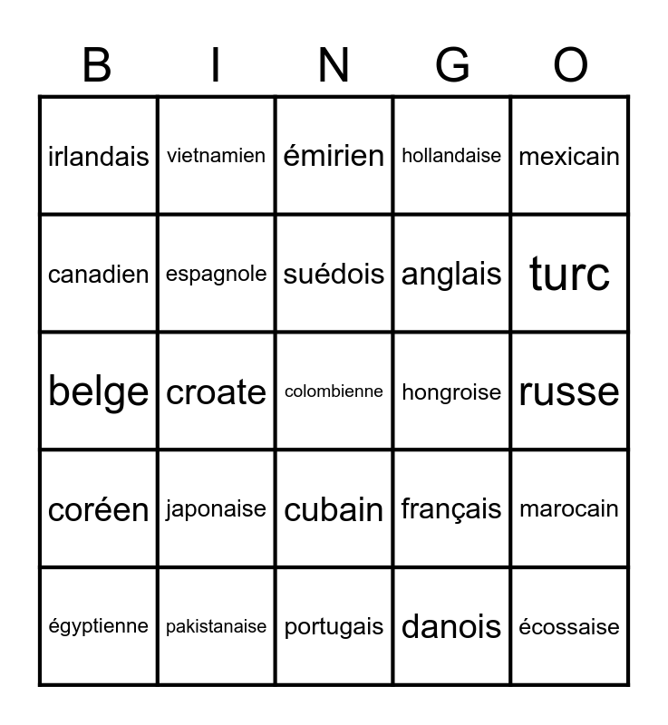 This bingo card has 30 words: pakistanaise, brésilien, croate, turque, irlandais, émirien, espagnole, cubain, hongroise, portugais, russe, colombienne, danois, écossaise, turc, mexicaine, français, coréen, japonaise, mexicain, belge, grecque, vietnamien, anglais, canadien, hollandaise, marocain, égyptienne, suédois and indienne.
