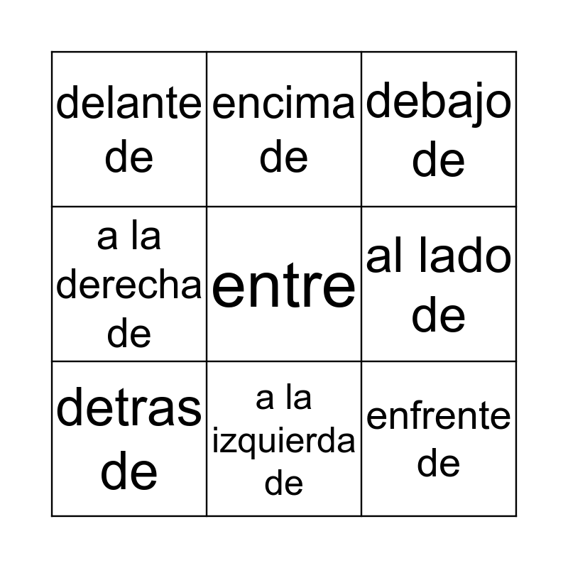 This bingo card has a free space and 8 words: al lado de, debajo de, encima de, detras de, delante de, enfrente de, a la derecha de and a la izquierda de.
