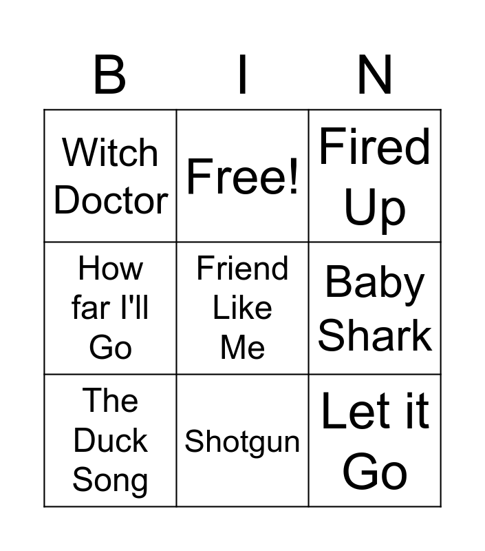 This bingo card has 12 words: Hakuna Mattata, Let it Go, Friend Like Me, Baby Shark, Free!, Fired Up, Shotgun, Dance Monkey, Witch Doctor, How far I'll Go, The Duck Song and Sweet Caroline.