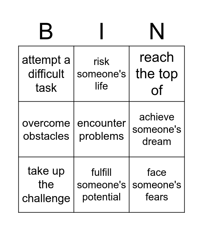 This bingo card has a free space and 8 words: achieve someone's dream, reach the top of, risk someone's life, take up the challenge, attempt a difficult task, face someone's fears, overcome obstacles and fulfill someone's potential.