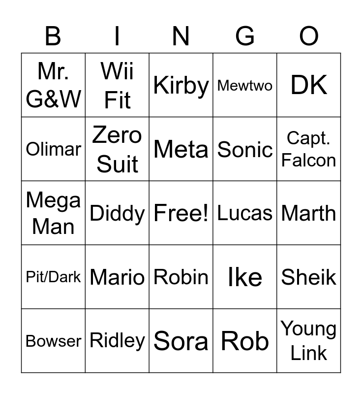 This bingo card has a free space and 24 words: Mario, Ridley, Meta, Bowser, DK, Mr. G&W, Olimar, Wii Fit, Lucas, Robin, Sonic, Mega Man, Ike, Sheik, Zero Suit, Rob, Marth, Kirby, Capt. Falcon, Diddy, Young Link, Pit/Dark, Mewtwo and Sora.