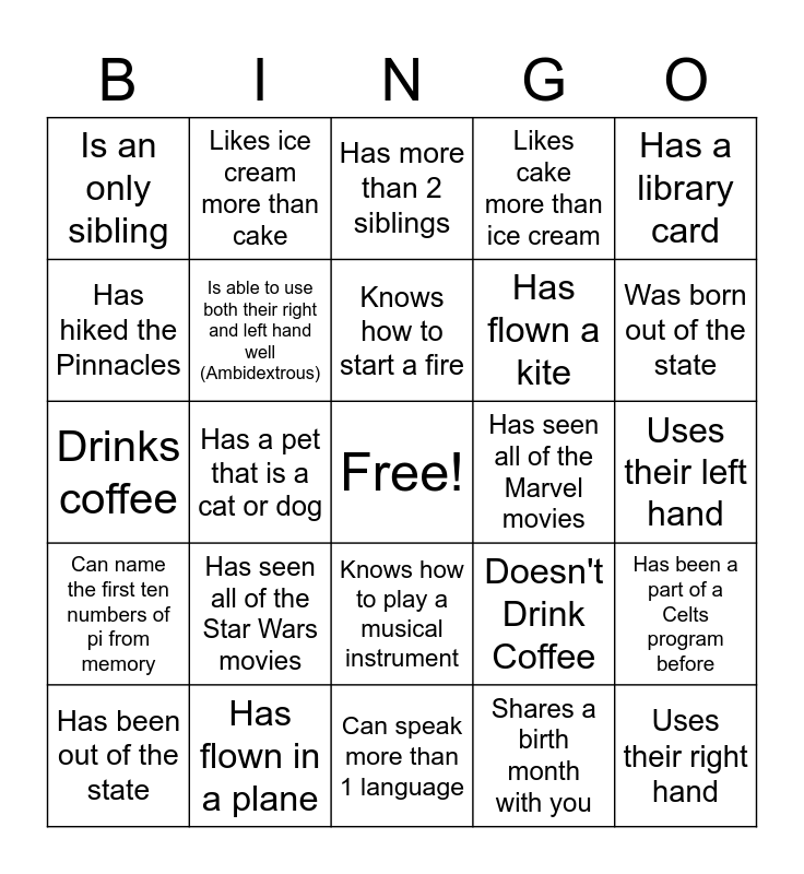 This bingo card has a free space and 29 words: Has been out of the state, Has been out of the country, Has a pet that is a cat or dog, Has a pet that isn't a cat or dog, Is an only sibling, Has more than 2 siblings, Is able to use both their right and left hand well (Ambidextrous), Has seen all of the Star Wars movies, Has seen all of the Marvel movies, Has flown in a plane, Uses their left hand, Uses their right hand, Can speak more than 1 language, Shares a birth month with you, Was born out of the state, Has done at least 1 extracurricular activity before, Knows how to play a musical instrument, Can name the first ten numbers of pi from memory, Has a library card, Drinks coffee, Doesn't Drink Coffee, Would be willing to hold a Tarantula, Has flown a kite, Has hiked the Pinnacles, Likes cake more than ice cream, Likes ice cream more than cake, Has been a part of a Celts program before, Knows how to start a fire and Has been camping.