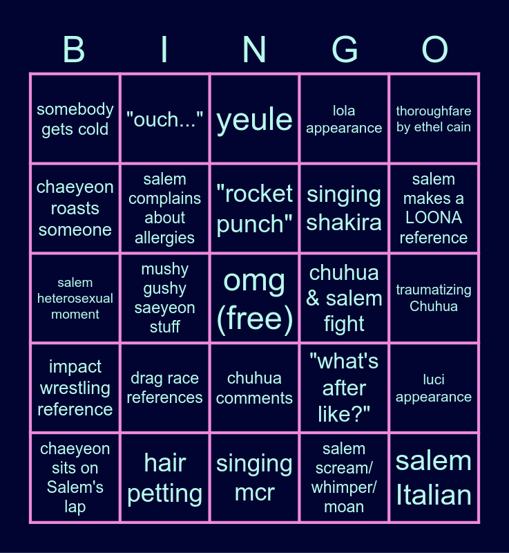 This bingo card has a free space and 34 words: salem talks about cheese, no Business!, "that's so embarrassing for you", kiss, traumatizing Chuhua, chaeyeon roasts someone, salem complains about allergies, singing mcr, singing shakira, salem Italian, salem heterosexual moment, "ouch...", salem scream/ whimper/ moan, gerard way, impact wrestling reference, mushy gushy saeyeon stuff, chuhua comments, chuhua & salem fight, luci appearance, chaeyeon sits on Salem's lap, hair petting, "I love that for you", lola appearance, salem makes a LOONA reference, "love your hair hope you win", drag race references, yeule, singing obscurity knocks, thoroughfare by ethel cain, somebody gets cold, song of the day, "rocket punch", "what's after like?" and "nananan anana dive into the ocean".