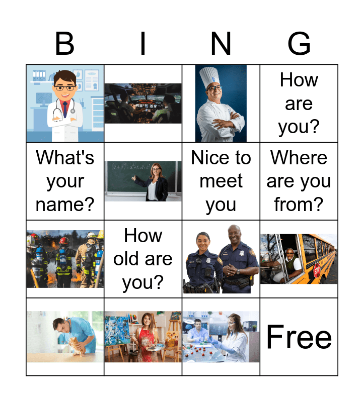 This bingo card has 10 images and 6 words: What's your name?, How are you?, How old are you?, Where are you from?, Nice to meet you and Free.