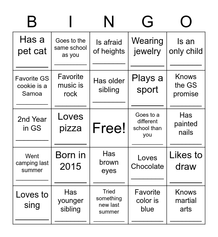 This bingo card has a free space and 24 words: Born in 2015 ______, Has younger sibling ________, Has older sibling ________, Loves to sing _______, Is an only child _______, Has a pet cat ______, Favorite GS cookie is a Samoa _________, Goes to the same school as you __________, Goes to a different school than you __________, Has brown eyes ________, Plays a sport ______, 2nd Year in GS ________, Loves Chocolate ________, Likes to draw ______, Favorite music is rock ________, Favorite color is blue ________, Has painted nails ________, Is afraid of heights ________, Knows the GS promise ________, Loves pizza ______, Knows martial arts ________, Went camping last summer __________, Wearing jewelry _______ and Tried something new last summer __________.