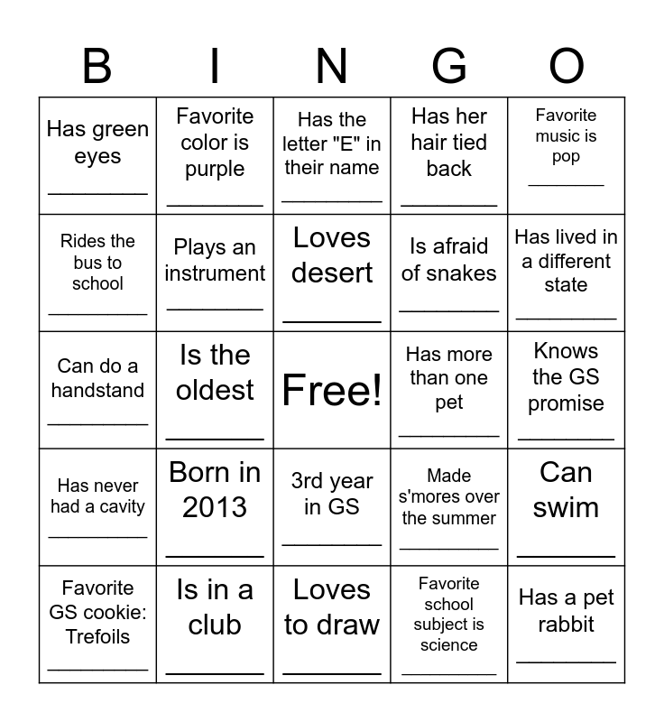 This bingo card has a free space and 24 words: Born in 2013 ______, Is in a club ______, Loves desert ______, Favorite GS cookie: Trefoils _________, Favorite music is pop ________, Has green eyes ________, Rides the bus to school __________, Favorite color is purple ________, Has more than one pet _________, 3rd year in GS ________, Is afraid of snakes ________, Can do a handstand _________, Made s'mores over the summer __________, Can swim ______, Plays an instrument ________, Favorite school subject is science __________, Knows the GS promise ________, Has the letter "E" in their name _________, Has lived in a different state _________, Is the oldest ______, Has a pet rabbit ________, Has never had a cavity __________, Has her hair tied back ________ and Loves to draw ______.