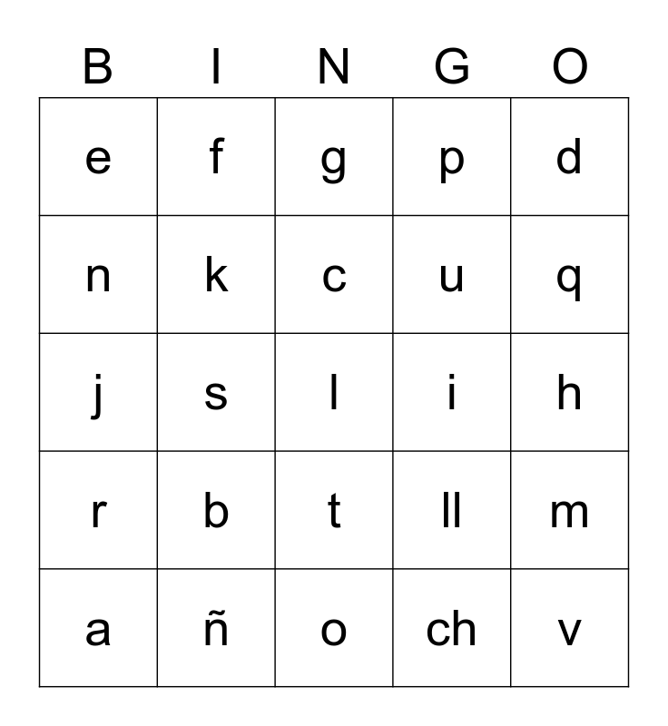 This bingo card has a free space and 24 words: a, b, c, ch, d, e, f, g, i, h, j, k, ll, m, n, ñ, o, p, q, r, s, t, u and v.