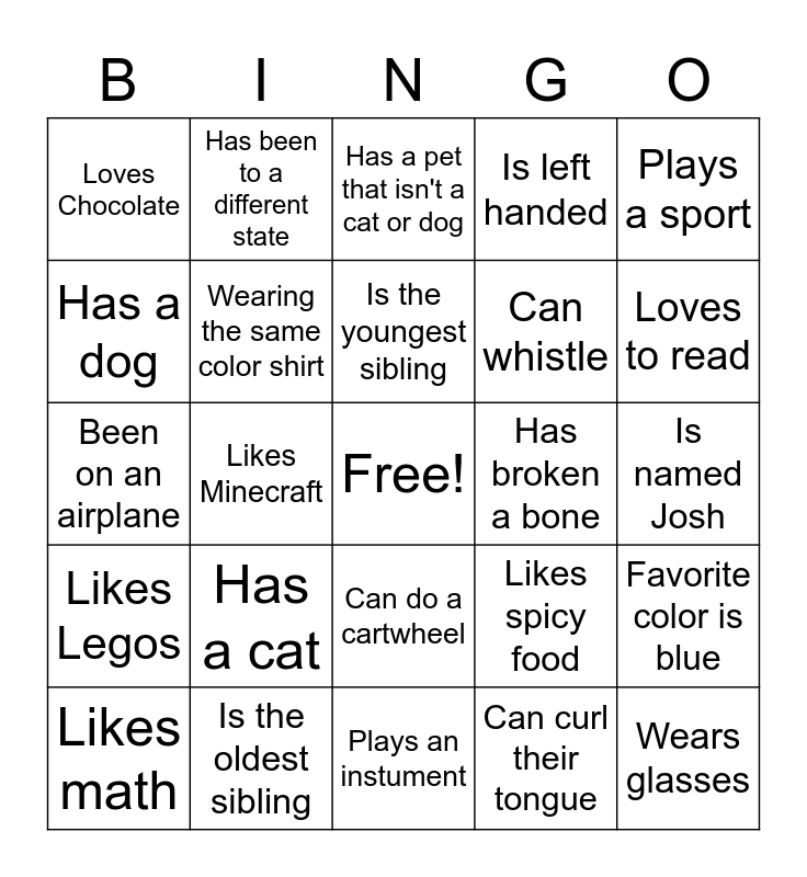 This bingo card has a free space and 24 words: Has a cat, Is the oldest sibling, Is the youngest sibling, Likes math, Plays a sport, Loves Chocolate, Has a dog, Has been to a different state, Has broken a bone, Can do a cartwheel, Can whistle, Been on an airplane, Likes spicy food, Favorite color is blue, Wearing the same color shirt, Can curl their tongue, Is named Josh, Has a pet that isn't a cat or dog, Loves to read, Likes Minecraft, Wears glasses, Likes Legos, Is left handed and Plays an instument.