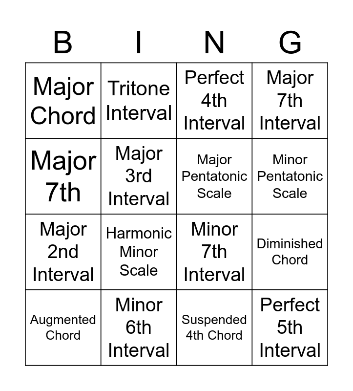 This bingo card has 28 words: Free!, Minor 2nd Interval, Major 2nd Interval, Minor 3rd Interval, Major 3rd Interval, Perfect 4th Interval, Tritone Interval, Perfect 5th Interval, Minor 6th Interval, Major 6th Interval, Minor 7th Interval, Major 7th Interval, Perfect 8ve Interval, Major Scale, Harmonic Minor Scale, Melodic Minor Scale, Natural Minor Scale, Major Pentatonic Scale, Minor Pentatonic Scale, Blues Scale, Major Chord, Minor Chord, Augmented Chord, Diminished Chord, Suspended 4th Chord, Dominant 7th Chord, Major 7th and Minor 7th.