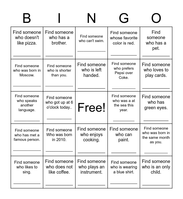 This bingo card has a free space and 25 words: Find someone Who was born in 2010. ____________, Find someone who plays an instrument. ___________, Find someone who is left handed. ___________, Find someone who likes to sing. ____________, Find someone who has a pet. ___________, Find someone who doesn't like pizza. ___________, Find someone who was born in Moscow. _____________, Find someone who has a brother. ___________, Find someone who was a at the sea this year. __________, Find someone who enjoys cooking. ___________, Find someone who prefers Pepsi over Coke. ___________, Find someone who speaks another language. ____________, Find someone who can paint. __________, Find someone who was born in the same month as you. ___________, Find someone who is shorter than you. _____________, Find someone who has been on a cruise. ___________, Find someone who has green eyes. __________, Find someone who can't swim. ______________, Find someone who loves to play cards. ___________, Find someone who got up at 6 o'clock today.. ___________, Find someone who is an only child. ___________, Find someone who does not like coffee. ___________, Find someone who has met a famous person. _____________, Find someone whose favorite color is red. ___________ and Find someone who is wearing a blue shirt. ____________.