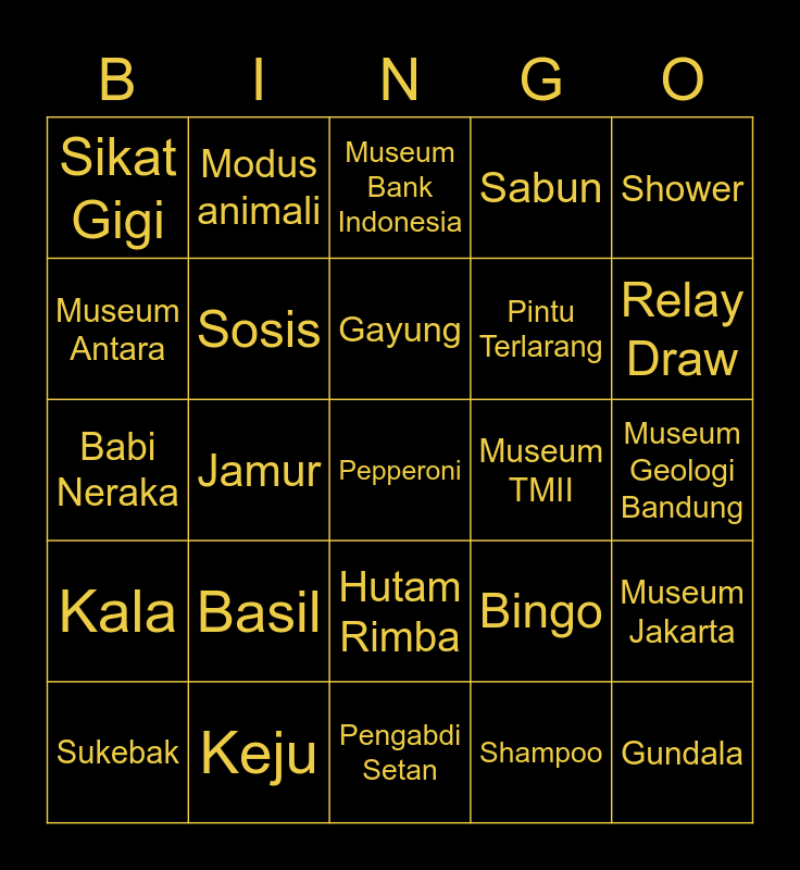 This bingo card has 25 words: Kala, Keju, Pepperoni, Shampoo, Shower, Sikat Gigi, Modus animali, Museum Bank Indonesia, Museum TMII, Museum Jakarta, Museum Antara, Sosis, Pengabdi Setan, Bingo, Relay Draw, Sukebak, Jamur, Gayung, Pintu Terlarang, Museum Geologi Bandung, Babi Neraka, Basil, Hutam Rimba, Sabun and Gundala.