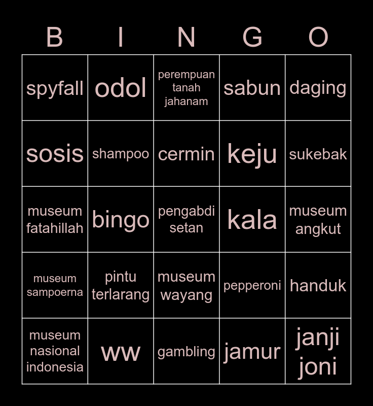 This bingo card has a free space and 24 words: pintu terlarang, ww, cermin, museum nasional indonesia, daging, spyfall, sosis, odol, kala, museum wayang, keju, museum fatahillah, pepperoni, handuk, shampoo, jamur, museum angkut, perempuan tanah jahanam, sukebak, bingo, janji joni, museum sampoerna, sabun and gambling.