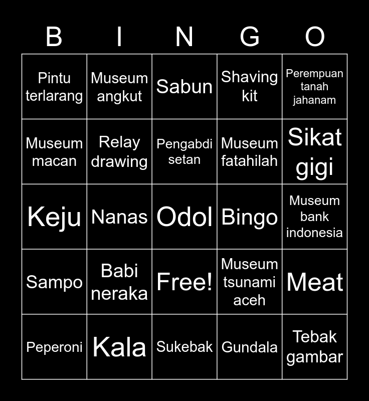 This bingo card has 26 words: Free!, Gundala, Pengabdi setan, Kala, Perempuan tanah jahanam, Pintu terlarang, Museum macan, Museum angkut, Museum bank indonesia, Museum tsunami aceh, Museum fatahilah, Keju, Meat, Peperoni, Nanas, Ayam, Shaving kit, Sampo, Sabun, Odol, Sikat gigi, Sukebak, Bingo, Babi neraka, Relay drawing and Tebak gambar.