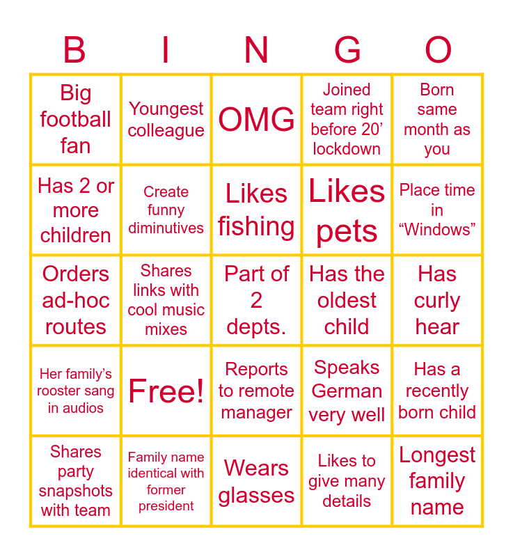 This bingo card has 25 words: Free!, Wears glasses, Likes fishing, Shares party snapshots with team, Born same month as you, Big football fan, Has 2 or more children, Youngest colleague, Has the oldest child, Reports to remote manager, Likes pets, Orders ad-hoc routes, Speaks German very well, Has a recently born child, Create funny diminutives, Longest family name, Has curly hear, OMG, Place time in “Windows”, Shares links with cool music mixes, Part of 2 depts., Family name identical with former president, Her family’s rooster sang in audios, Joined team right before 20’ lockdown and Likes to give many details.