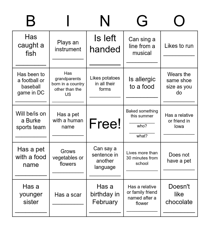 This bingo card has a free space and 29 words: Has a younger sister _________, Rides their bike or walks to school __________, Has a pet with a human name ___________, Can whistle loudly _______, Has caught a fish ________, Is left handed ______, Has grandparents born in a country other than the US _____________, Grows vegetables or flowers ___________, Baked something this summer ___________ who? ___________ what?, Has a scar __________, Has a relative or friend in Iowa ____________, Doesn't like chocolate _________, Has a birthday in February _________, Has a relative or family friend named after a flower ____________, Wears the same shoe size as you do ___________, Knows how to cook rice ________, Can say a sentence in another language ___________, Has a pet with a food name _________, Likes to run __________, Will be/is on a Burke sports team __________, Lives more than 30 minutes from school _____________, Is taking one of the Burke busses to school this year ____________, Is allergic to a food _________, Has been to a football or baseball game in DC ___________, Can sing a line from a musical __________, Plays an instrument __________, Does not have a pet ___________, Likes potatoes in all their forms ____________ and Went to the movies this summer ___________.