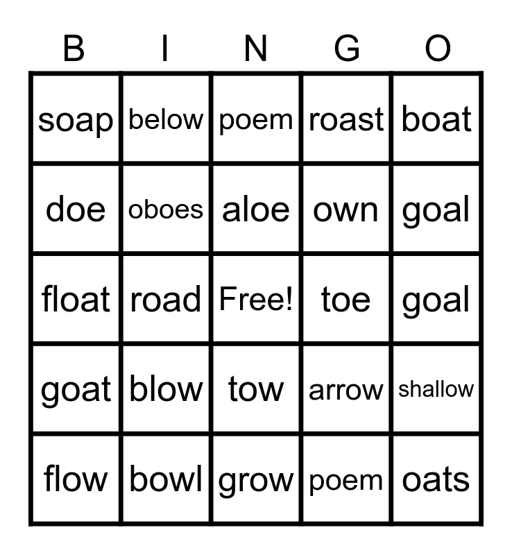 This bingo card has a free space and 24 words: blow, bowl, aloe, flow, boat, soap, doe, below, toe, tow, own, float, arrow, shallow, oboes, poem, goal, poem, goal, road, oats, goat, roast and grow.