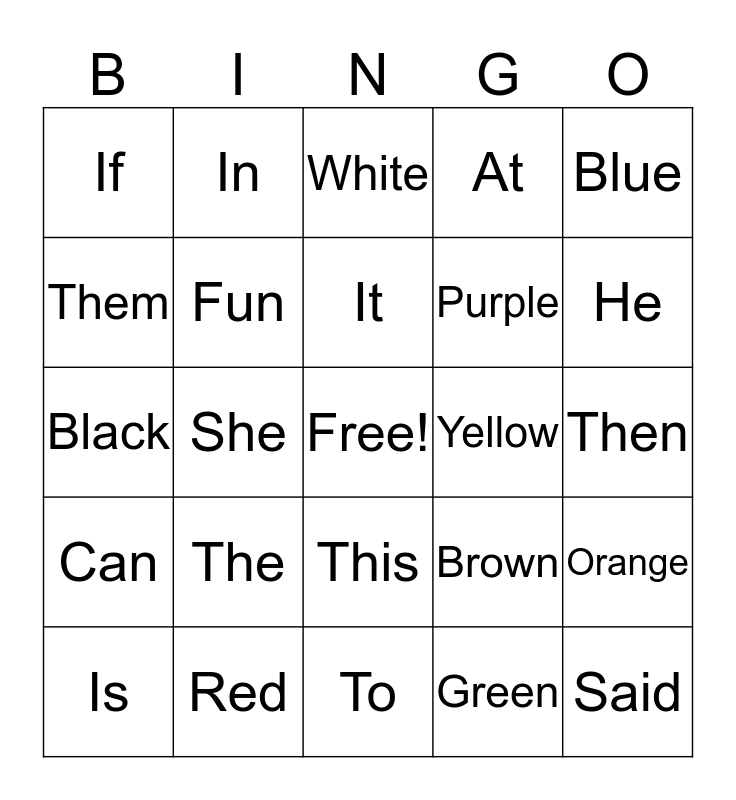 This bingo card has a free space and 24 words: The, Red, It, Is, Blue, If, Them, In, Yellow, This, Purple, Black, Brown, Orange, Fun, Green, Then, White, He, She, Said, Can, At and To.