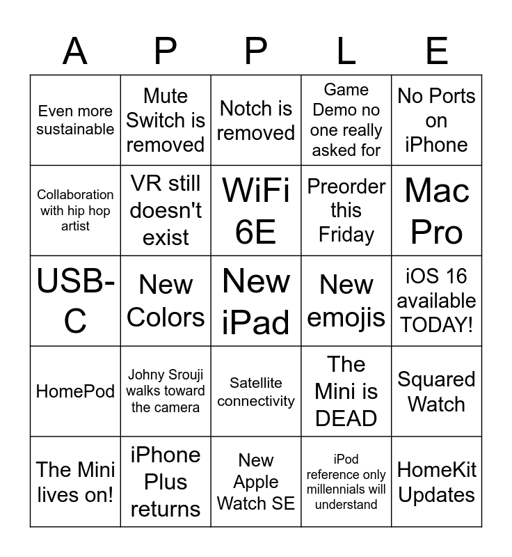 This bingo card has 35 words: Always on Display, Better MagSafe, Craig makes a funny joke, VR still doesn't exist, Satellite connectivity, Game Demo no one really asked for, Collaboration with hip hop artist, eSIM-only design, WiFi 6E, Tim Cook says Good Morning 3x, USB-C, No Ports on iPhone, New Apple TV, Feature stolen from Android/Samsung, Even more sustainable, New emojis, iPod reference only millennials will understand, New Colors, HomePod, New iPad, The Mini is DEAD, The Mini lives on!, Squared Watch, iPhone Plus returns, Notch is removed, Mac Pro, HomeKit Updates, New AirPods, Preorder this Friday, iOS 16 available TODAY!, Pill shaped cutout for Face ID, New Apple Watch SE, Johny Srouji walks toward the camera, Mute Switch is removed and Apple Watch Pro.