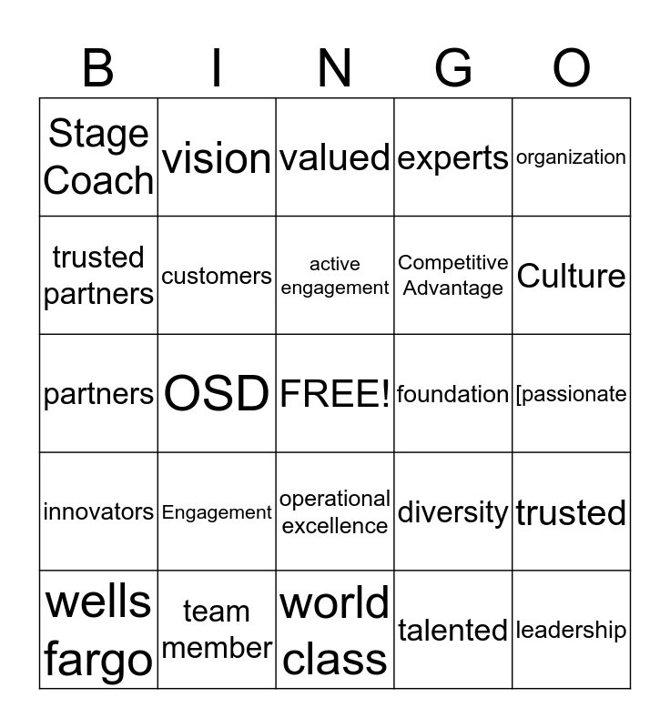 This bingo card has a free space and 24 words: Engagement, team member, active engagement, wells fargo, organization, Stage Coach, trusted partners, vision, foundation, operational excellence, Competitive Advantage, partners, diversity, trusted, customers, talented, [passionate, valued, Culture, OSD, leadership, innovators, experts and world class.
