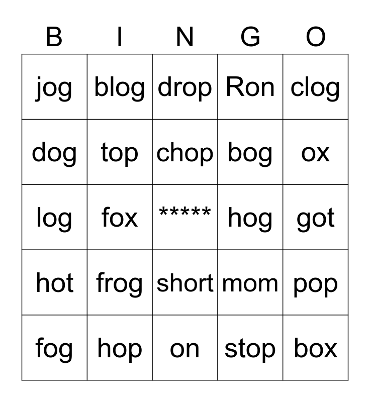 This bingo card has a free space and 24 words: frog, hop, chop, fog, clog, jog, dog, blog, hog, short, bog, log, mom, pop, top, stop, got, drop, ox, fox, box, hot, Ron and on.