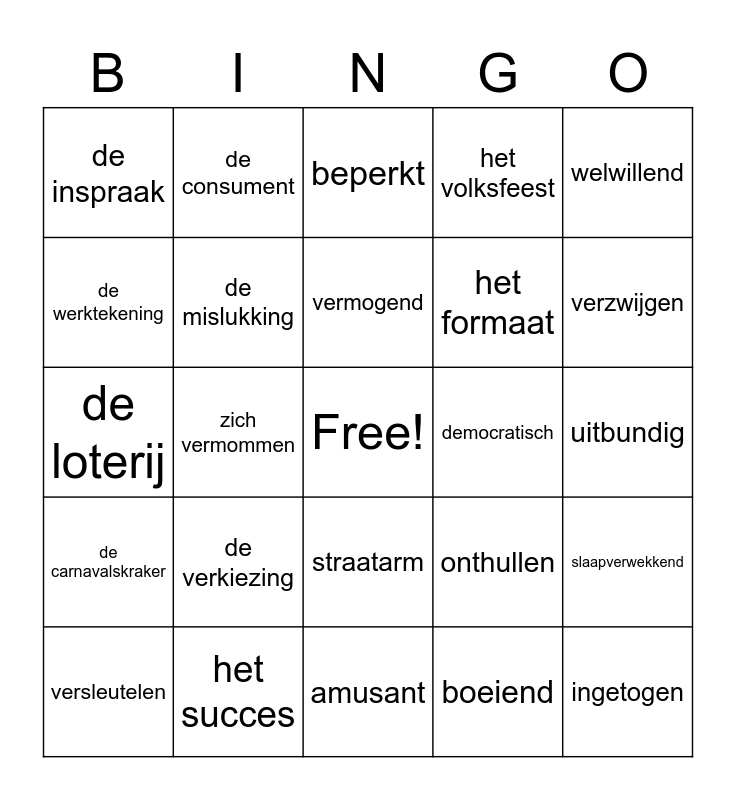 This bingo card has a free space and 40 words: de sponsorloop, de loterij, de rommelmarkt, de mislukking, het succes, straatarm, vermogend, afwijzend, welwillend, de carnavalskraker, zich vermommen, het volksfeest, ingetogen, uitbundig, democratisch, de verkiezing, het stemrecht, de inspraak, volledig, beperkt, slaapverwekkend, boeiend, het formaat, de werktekening, het bovenaanzicht, de doorsnede, abrupt, allengs, het dialect, de standaardtaal, een code breken, versleutelen, ontcijferen, onthullen, verzwijgen, amusant, verleidelijk, informatief, de consument and de producent.