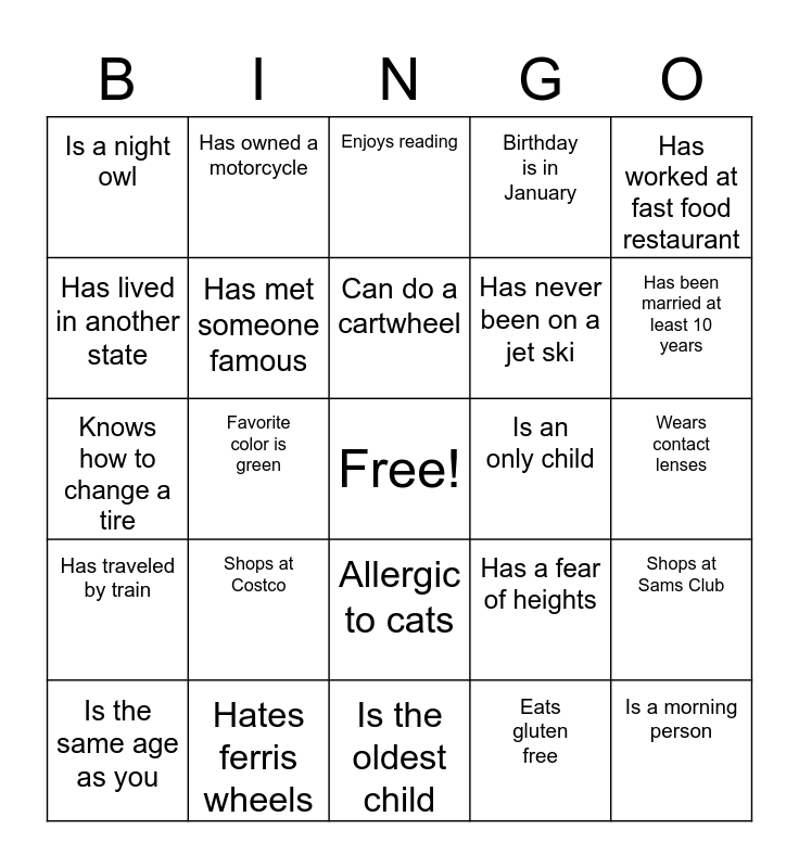 This bingo card has a free space and 24 words: Shops at Costco, Hates ferris wheels, Can do a cartwheel, Is the same age as you, Has worked at fast food restaurant, Is a night owl, Has lived in another state, Has owned a motorcycle, Is an only child, Allergic to cats, Has never been on a jet ski, Knows how to change a tire, Has a fear of heights, Shops at Sams Club, Has met someone famous, Eats gluten free, Wears contact lenses, Enjoys reading, Has been married at least 10 years, Favorite color is green, Is a morning person, Has traveled by train, Birthday is in January and Is the oldest child.