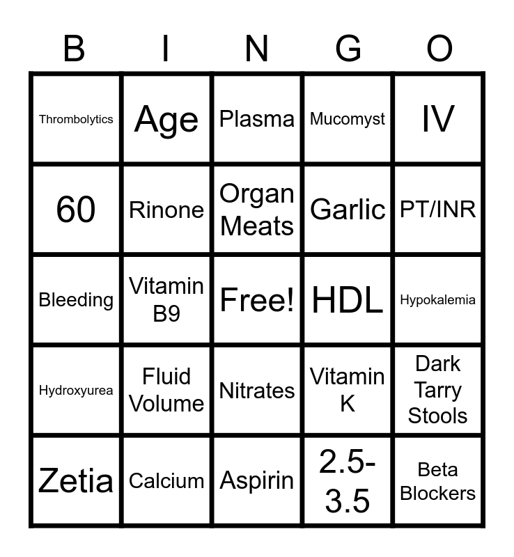 This bingo card has a free space and 24 words: Fluid Volume, Calcium, Organ Meats, Zetia, IV, Thrombolytics, 60, Age, HDL, Nitrates, Garlic, Bleeding, Vitamin K, Dark Tarry Stools, Rinone, 2.5-3.5, Hypokalemia, Plasma, PT/INR, Vitamin B9, Beta Blockers, Hydroxyurea, Mucomyst and Aspirin.