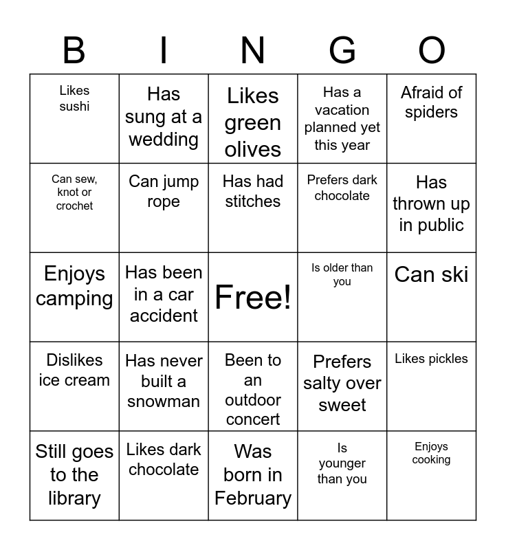This bingo card has a free space and 24 words: Has never built a snowman, Likes dark chocolate, Has had stitches, Still goes to the library, Afraid of spiders, Likes sushi, Can sew, knot or crochet, Has sung at a wedding, Is older than you, Been to an outdoor concert, Prefers dark chocolate, Enjoys camping, Prefers salty over sweet, Likes pickles, Can jump rope, Is younger than you, Can ski, Likes green olives, Has thrown up in public, Has been in a car accident, Enjoys cooking, Dislikes ice cream, Has a vacation planned yet this year and Was born in February.