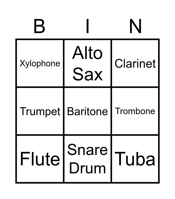 This bingo card has 9 words: Flute, Clarinet, Alto Sax, Trumpet, Xylophone, Trombone, Baritone, Tuba and Snare Drum.