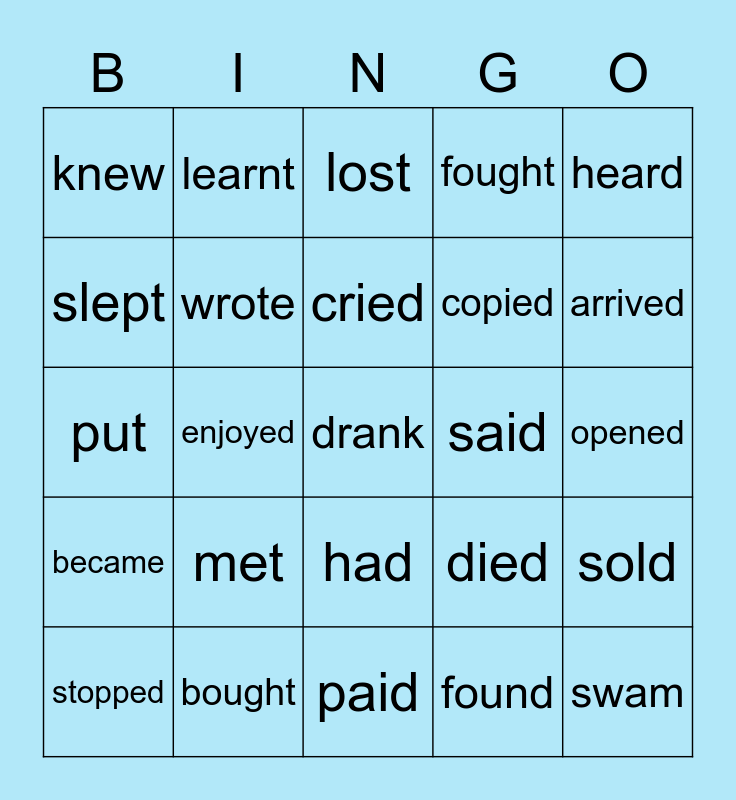 This bingo card has 25 words: became, bought, drank, found, heard, knew, learnt, lost, said, sold, slept, wrote, paid, died, arrived, stopped, enjoyed, cried, copied, opened, put, met, had, fought and swam.