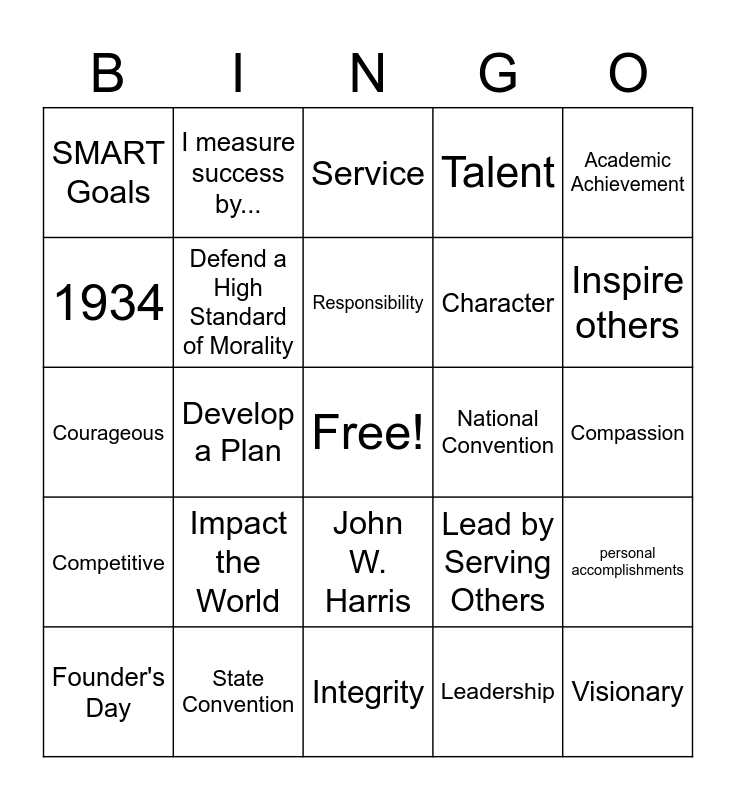 This bingo card has a free space and 24 words: Impact the World, State Convention, Responsibility, Founder's Day, Academic Achievement, SMART Goals, 1934, I measure success by..., National Convention, John W. Harris, Character, Courageous, Lead by Serving Others, personal accomplishments, Defend a High Standard of Morality, Leadership, Compassion, Service, Inspire others, Develop a Plan, Visionary, Competitive, Talent and Integrity.
