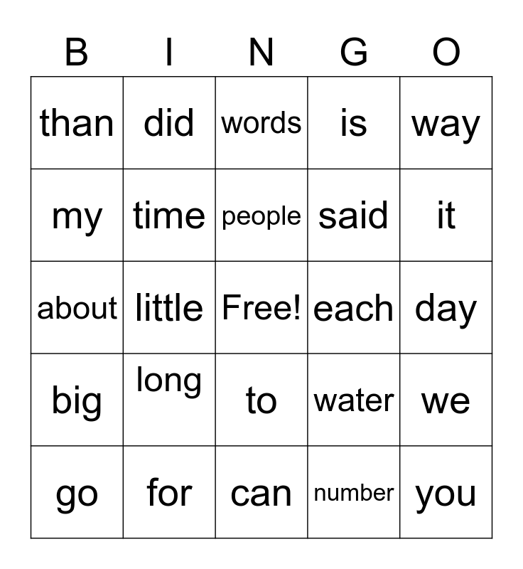 This bingo card has a free space and 24 words: go, long, people, number, way, than, did, words, each, day, about, time, water, we, my, for, can, is, it, big, little, to, said and you.