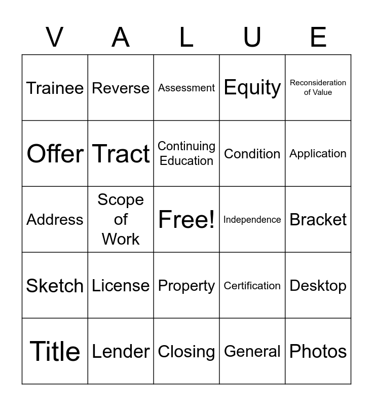 This bingo card has a free space and 100 words: Appraisal, Reconciliation, Bracket, Neighborhood, Market, Comparable, Borrower, Refinance, Purchase, Analysis, Match-paired, Credible, Narrative, Lender, Client, USPAP, Condition, Quality, Freddie, Fannie, FHA, Data, Realtor, Contract, AIR, Independence, Reconsideration of Value, Certification, Location, Transfer, Scope of Work, Trainee, Licensee, Certified, General, Continuing Education, Desktop, Hybrid, Accessory Unit, Utility, Obsolescence, Acreage, Address, AMC, Application, Assessment, AXIS, Building, Buyer, Closing, Collateral, Conforming, Conventional, Deed, Dimensions, E&O, Earnest Money, Easement, Encroachment, Equity, Fee Simple, Flood Map, Foreclosure, Floorplan, GLA, Housing, Inspection, Jumbo, Land, Leasehold, Legal Description, License, Loan, Loan Purpose, Loan Type, Mortgage, Multi-Family, Offer, Originator, Owner, Parcel, Photos, Plat Map, Property, Remodel, Reverse, Rural, Seller, Site, Sketch, Square Feet, Suburban, Taxes, Title, Tract, URAR, Urban, USDA, Value and Zoning.