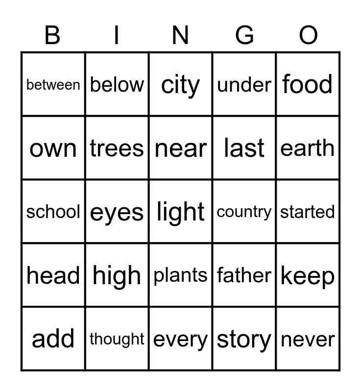 This bingo card has 25 words: high, every, near, add, food, between, own, below, country, plants, last, school, father, keep, trees, never, started, city, earth, eyes, light, thought, head, under and story.