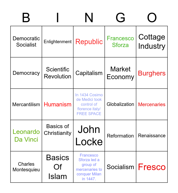 This bingo card has a free space and 24 words: Basics of Christianity, Basics Of Islam, Capitalism, Charles Montesquieu, Cottage Industry, Democratic Socialist, Democracy, Enlightenment, Globalization, John Locke, Market Economy, Mercantilism, Reformation, Renaissance, Scientific Revolution, Socialism, Mercenaries, Republic, Burghers, Humanism, Fresco, Leonardo Da Vinci, Francesco Sforza and Francesco Sforza led a group of mercenaries to conquer Milan in 1447..