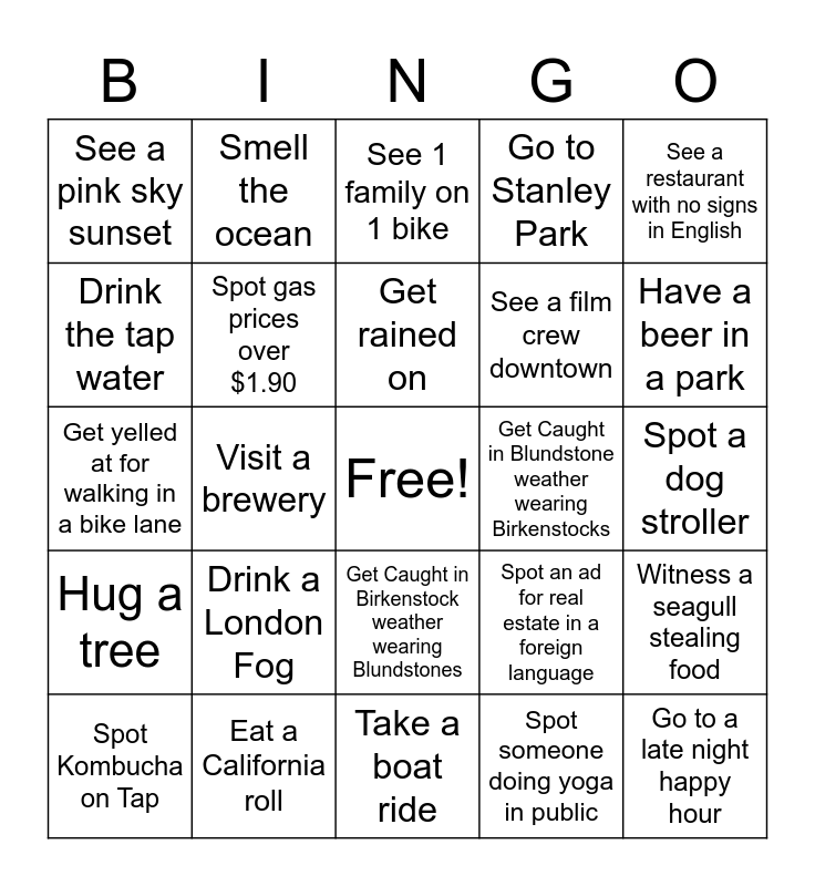 This bingo card has a free space and 24 words: Drink a London Fog, Eat a California roll, Get rained on, Spot Kombucha on Tap, See a restaurant with no signs in English, See a pink sky sunset, Drink the tap water, Smell the ocean, Get Caught in Blundstone weather wearing Birkenstocks, Get Caught in Birkenstock weather wearing Blundstones, See a film crew downtown, Get yelled at for walking in a bike lane, Spot an ad for real estate in a foreign language, Witness a seagull stealing food, Spot gas prices over $1.90, Spot someone doing yoga in public, Spot a dog stroller, See 1 family on 1 bike, Have a beer in a park, Visit a brewery, Go to a late night happy hour, Hug a tree, Go to Stanley Park and Take a boat ride.