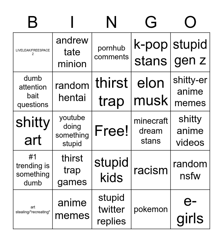 This bingo card has a free space and 27 words: racism, mrbeast, elon musk, stupid twitter replies, dumb attention bait questions, pornhub comments, andrew tate minion, #1 trending is something dumb, minecraft dream stans, random nsfw, shitty art, k-pop stans, art stealing/"recreating", anime memes, shitty-er anime memes, anime stans, random hentai, thirst trap, thirst trap games, LIVELEAK/FREESPACE 2, shitty anime videos, pokemon, youtube doing something stupid, e-girls, stupid kids, stupid gen z and people with guns being stupid.