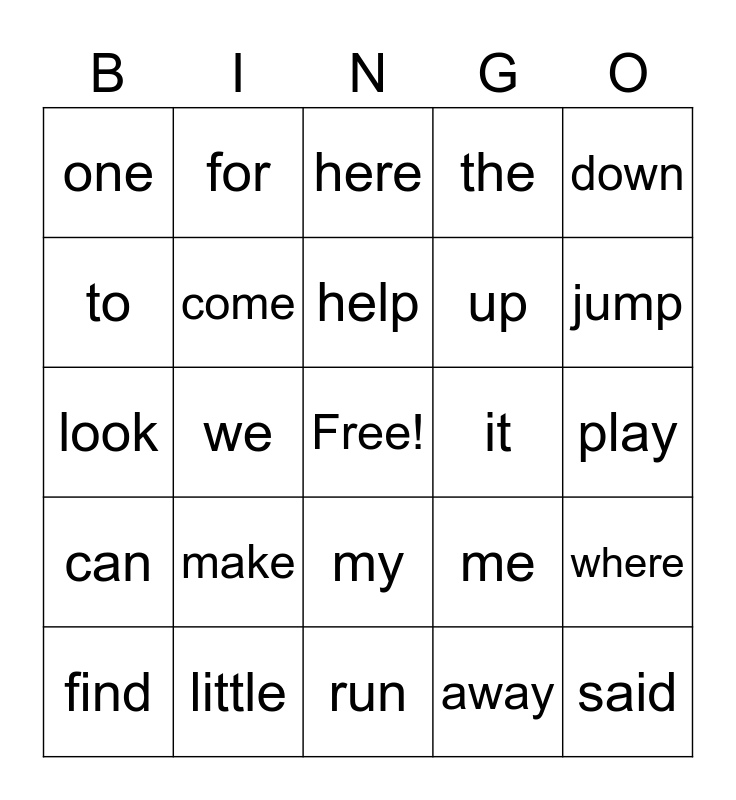 This bingo card has a free space and 34 words: and, away, big, blue, can, come, down, find, for, funny, help, here, in, is, it, jump, little, look, make, me, my, not, one, play, run, said, the, you, up, to, two, we, where and yellow.