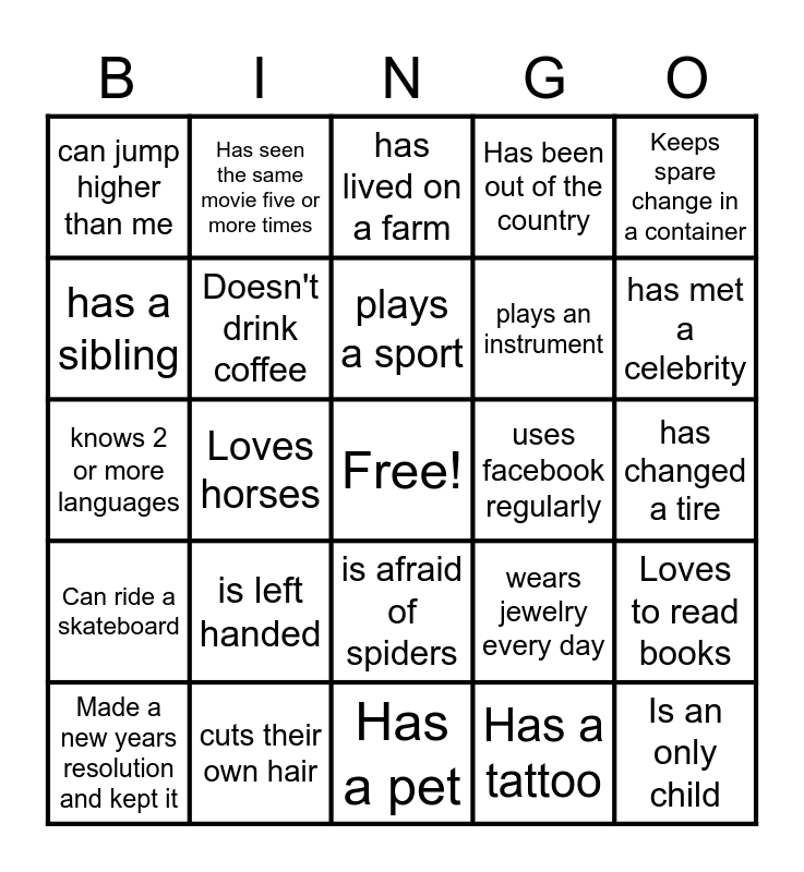 This bingo card has a free space and 24 words: is left handed, cuts their own hair, plays a sport, Made a new years resolution and kept it, Keeps spare change in a container, can jump higher than me, has a sibling, Has seen the same movie five or more times, uses facebook regularly, is afraid of spiders, plays an instrument, knows 2 or more languages, wears jewelry every day, Loves to read books, Doesn't drink coffee, Has a tattoo, has changed a tire, has lived on a farm, has met a celebrity, Loves horses, Is an only child, Can ride a skateboard, Has been out of the country and Has a pet.