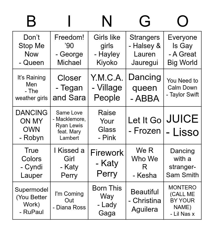 This bingo card has 25 words: I Kissed a Girl - Katy Perry, Born This Way - Lady Gaga, Y.M.C.A. - Village People, Supermodel (You Better Work) - RuPaul, Everyone Is Gay - A Great Big World, Don’t Stop Me Now - Queen, It’s Raining Men - The weather girls, Freedom! ’90 - George Michael, Let It Go - Frozen, Firework - Katy Perry, Dancing queen - ABBA, DANCING ON MY OWN - Robyn, We R Who We R - Kesha, Dancing with a stranger- Sam Smith, Closer - Tegan and Sara, MONTERO (CALL ME BY YOUR NAME) - Lil Nas x, JUICE - Lisso, Girls like girls - Hayley Kiyoko, You Need to Calm Down - Taylor Swift, Same Love - Macklemore, Ryan Lewis feat. Mary Lambert, Raise Your Glass - Pink, I'm Coming Out - Diana Ross, True Colors - Cyndi Lauper, Strangers - Halsey & Lauren Jauregui and Beautiful - Christina Aguilera.