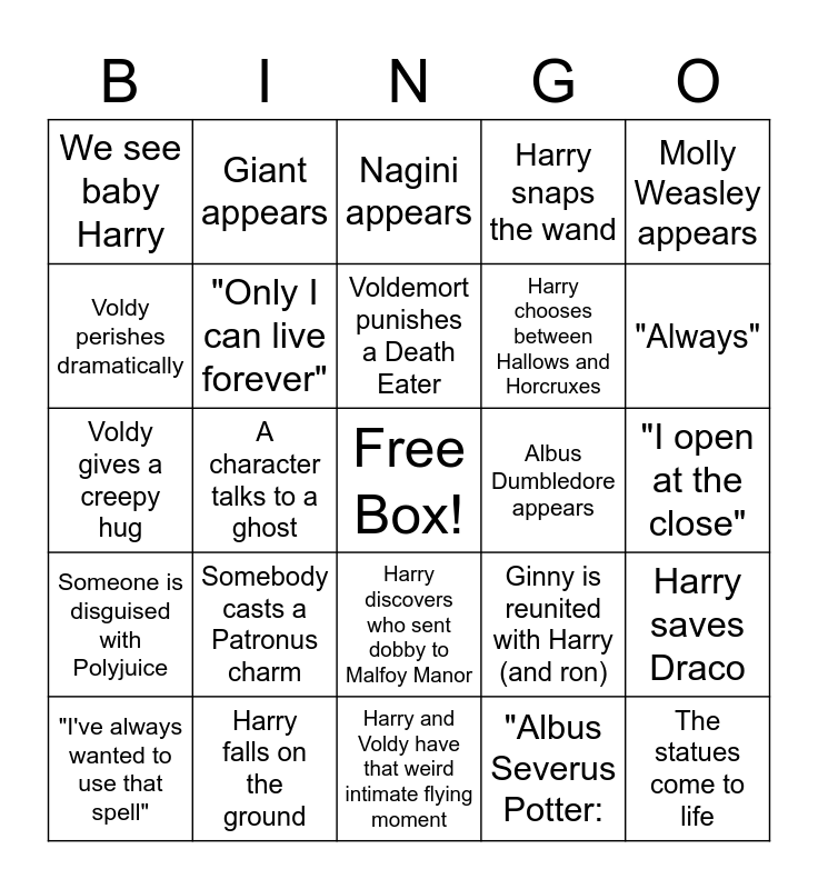 This bingo card has a free space and 34 words: Ollivander holds a wand, "Albus Severus Potter:, "You and whose army?", Harry has a vision, Someone is disguised with Polyjuice, "Only I can live forever", Molly Weasley appears, "I've always wanted to use that spell", Giant appears, "That's my girlfirend you numpty", Voldemort punishes a Death Eater, Nagini appears, Filch runs through the great hall, The 'Ron and Hermione' Moment, Albus Dumbledore appears, "Always", Harry falls on the ground, Voldy gives a creepy hug, Somebody casts a Patronus charm, Ginny is reunited with Harry (and ron), Harry discovers who sent dobby to Malfoy Manor, "not my daughter you b****", We see baby Harry, "I open at the close", Harry and Voldy have that weird intimate flying moment, The statues come to life, Harry snaps the wand, Neville kills the horcrux, Harry chooses between Hallows and Horcruxes, Voldy perishes dramatically, 19 years later, A character talks to a ghost, Harry saves Draco and Bellatrix speaks.