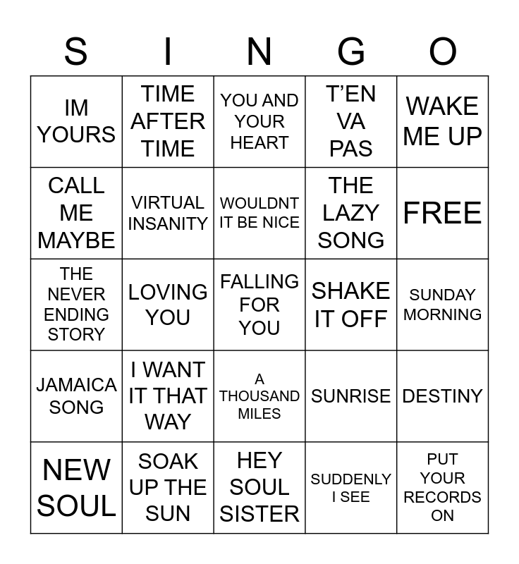 This bingo card has 25 words: I WANT IT THAT WAY, HEY SOUL SISTER, WOULDNT IT BE NICE, NEW SOUL, WAKE ME UP, IM YOURS, CALL ME MAYBE, TIME AFTER TIME, SHAKE IT OFF, A THOUSAND MILES, THE LAZY SONG, THE NEVER ENDING STORY, SUNRISE, DESTINY, VIRTUAL INSANITY, PUT YOUR RECORDS ON, SUNDAY MORNING, YOU AND YOUR HEART, FREE, LOVING YOU, FALLING FOR YOU, SOAK UP THE SUN, JAMAICA SONG, T’EN VA PAS and SUDDENLY I SEE.