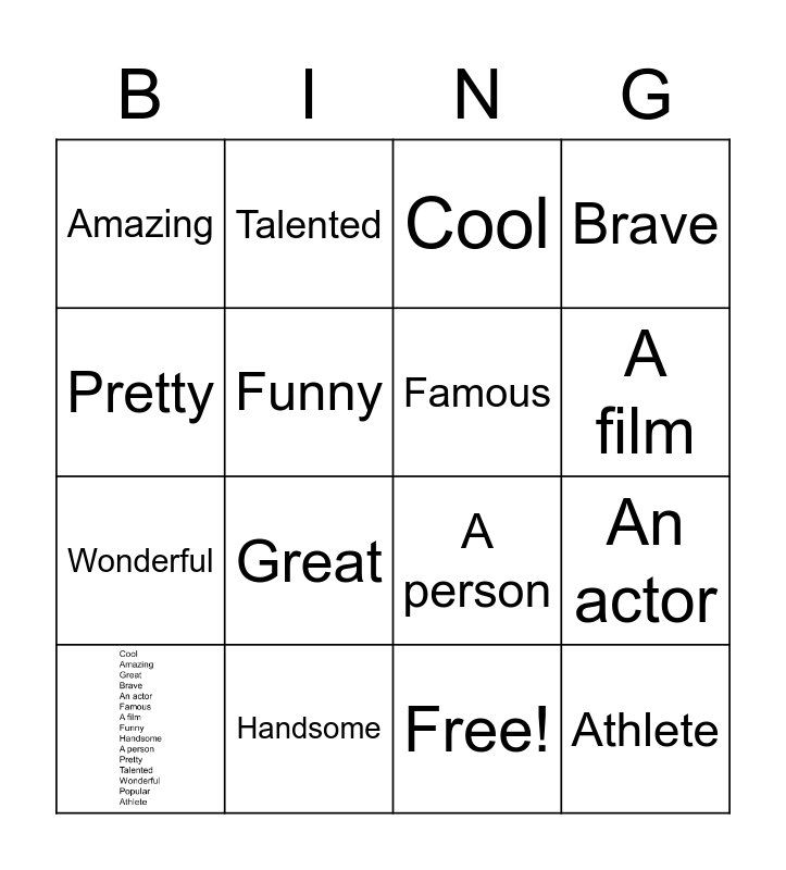 This bingo card has 1 images and 16 words: Free!, Cool, Amazing, Great, Brave, An actor, Famous, A film, Funny, Handsome, A person, Pretty, Talented, Wonderful, Popular and Athlete.