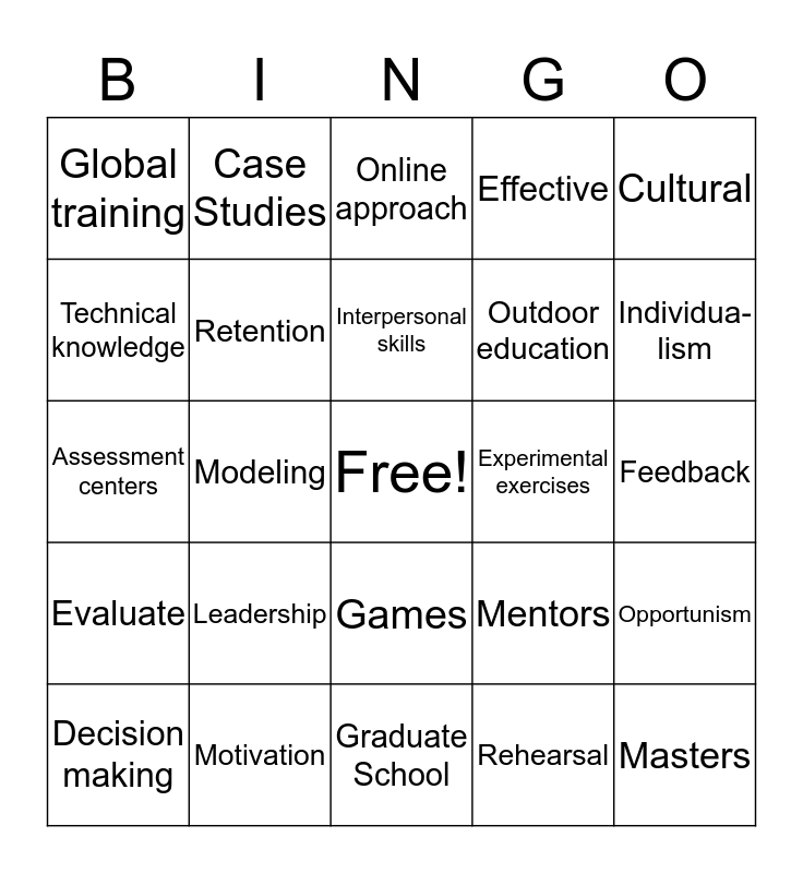 This bingo card has a free space and 24 words: Leadership, Motivation, Interpersonal skills, Decision making, Cultural, Global training, Technical knowledge, Case Studies, Experimental exercises, Games, Outdoor education, Assessment centers, Mentors, Opportunism, Retention, Rehearsal, Feedback, Online approach, Individua-lism, Modeling, Masters, Evaluate, Effective and Graduate School.