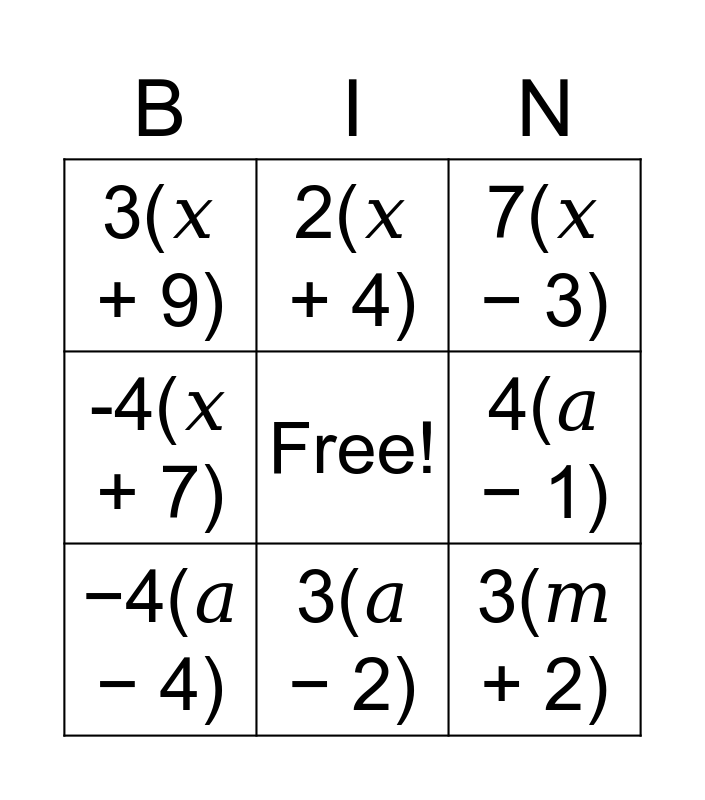 This bingo card has a free space and 8 words: -4(𝑥 + 7), 2(𝑥 + 4), 4(𝑎 − 1), −4(𝑎 − 4), 7(𝑥 − 3), 3(𝑥 + 9), 3(𝑎 − 2) and 3(𝑚 + 2).