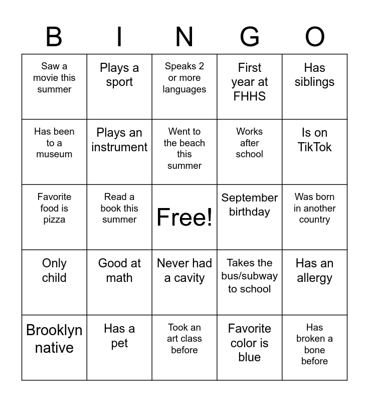 This bingo card has a free space and 24 words: Brooklyn native, Good at math, Went to the beach this summer, Favorite color is blue, Has siblings, Saw a movie this summer, Plays a sport, Speaks 2 or more languages, September birthday, Was born in another country, Favorite food is pizza, Plays an instrument, Takes the bus/subway to school, Has an allergy, Has been to a museum, Has a pet, Took an art class before, First year at FHHS, Is on TikTok, Only child, Read a book this summer, Never had a cavity, Works after school and Has broken a bone before.