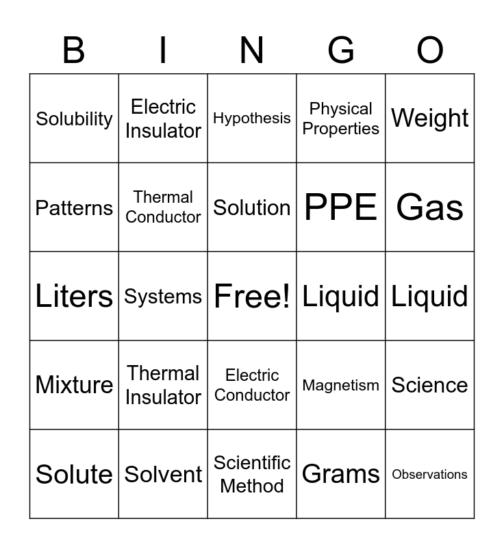 This bingo card has a free space and 34 words: Mass, Grams, Solid, Physical State, Mixture, Thermal Conductor, Weight, Solute, Electric Insulator, Data, Solution, Hypothesis, Density, Volume, Liquid, Gas, Solvent, Liters, Thermal Insulator, Magnetism, Electric Conductor, Pounds, Solubility, Liquid, Scientific Method, Observations, Physical Properties, Lab Safety, PPE, Patterns, Change, Systems, Science and Constancy.